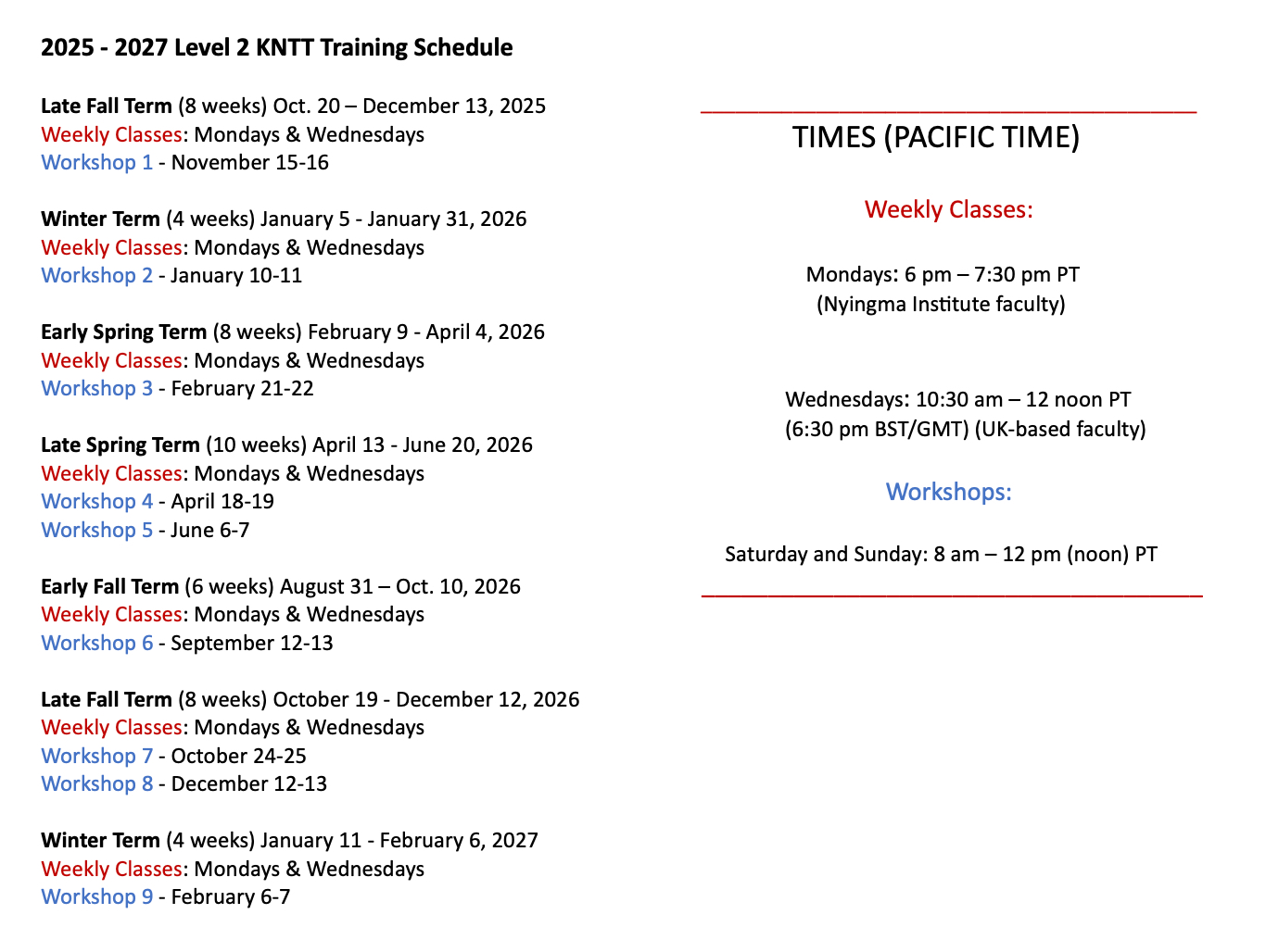 As this is an online training, it allows for participation by those who live at a distance from Berkeley. The weekly class is presented online at two different times each week to accommodate different time zones: Monday evenings BST/GMT led by our assisting instructors in the U.K. and Ireland; and Tuesday evenings Pacific Time led by Nyingma Institute faculty. See schedule posted below for dates and times.